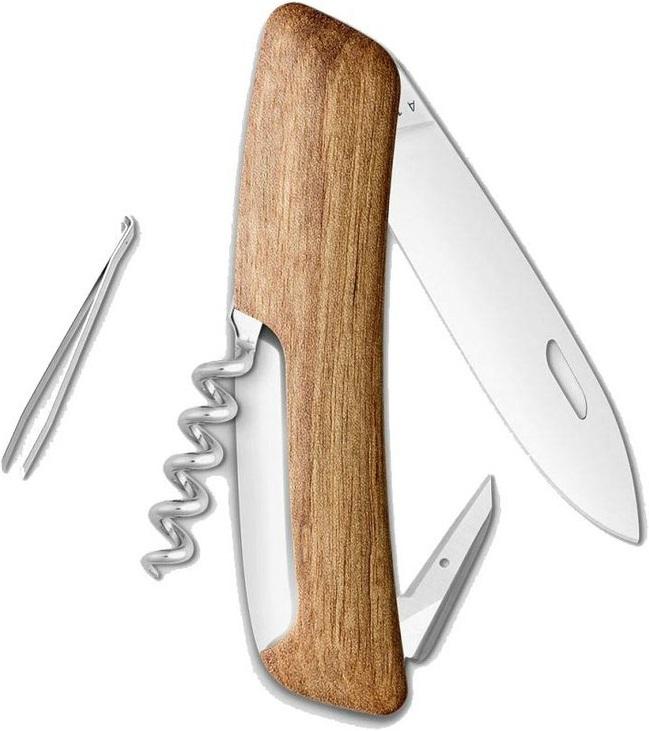 Švajčiarsky vreckový nôž s ergonomickou rukoväťou z orechového dreva, kvalitnou nerezovou čepeľou a praktickými nástrojmi pre každodenné použitie.