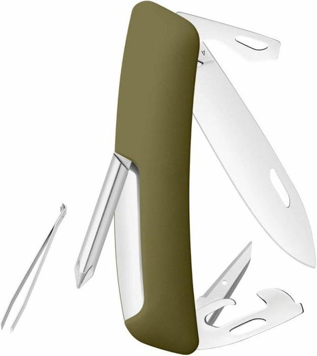 Revoluční tvar a střenka nabízejí měkký úchop, díky kterému je tento nůž jedním z nejpohodlnějších a nejsnadněji použitelných nožů vůbec. Pojistka je integrována přímo do střenky a chráněna měkkou pryží, což zvyšuje bezpečnost při manipulaci. Aktivujete ji pouhým stisknutím loga Swiza na střence, což umožňuje rychlé a jednoduché zajištění čepele.