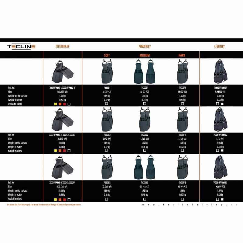 Plutvy Tecline LIGHTJET spájajú výhody technických plutiev (JET) s ľahkosťou rekreačných plutiev. Tieto potápačské plutvy majú ergonomický tvar botičiek a odolné pružiny. Sú veľmi pohodlné pri obúvaní, plávaní i vyzúvaní. Vďaka svojej ľahkosti sú ideálne na cestovanie, pričom stále poskytujú vynikajúci výkon pri potápaní.