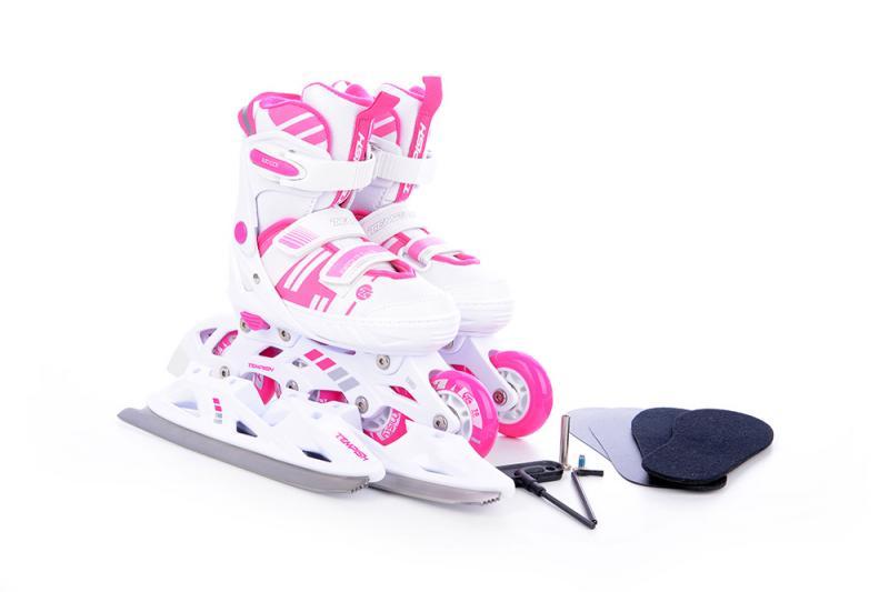 Dětské roztahovací brusle se speciální duální konstrukcí pro celoroční rekreační bruslení. Konstrukční systém umožňuje záměnu zimních bruslí za podvozek s kolečky. Jednoduchým povolením dvou šroubů přeměníte zimní brusle na kolečkové inline brusle a naopak.