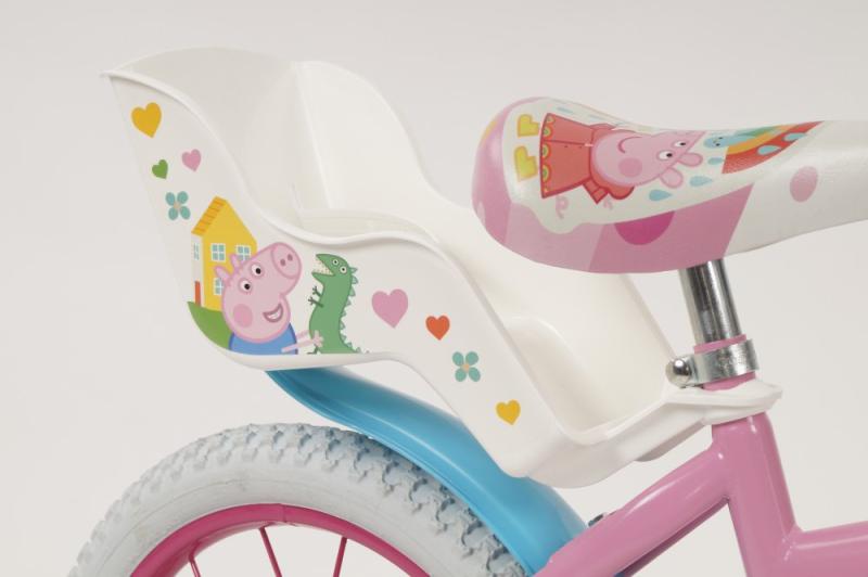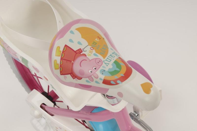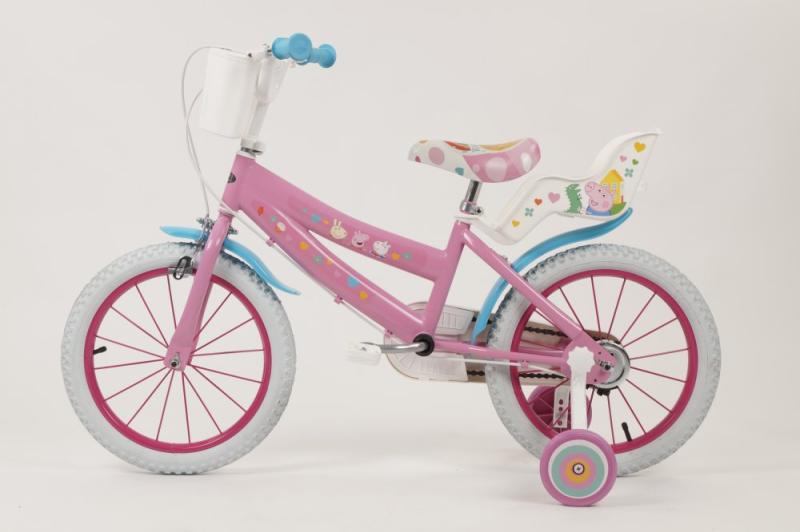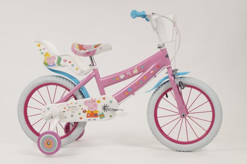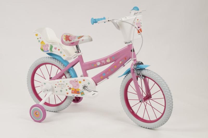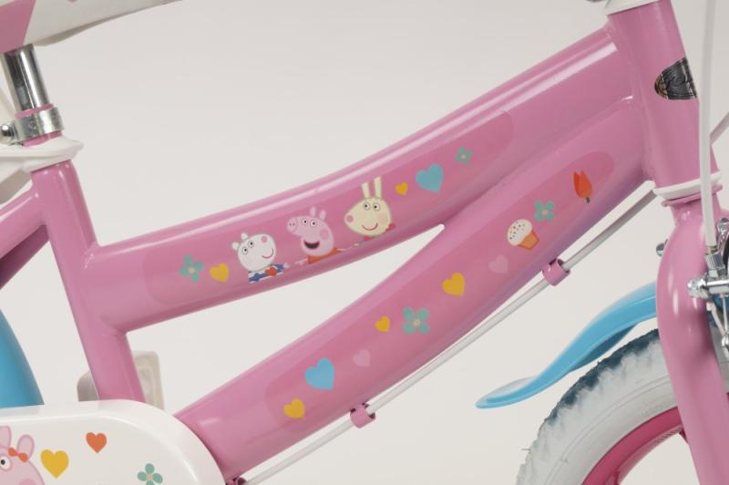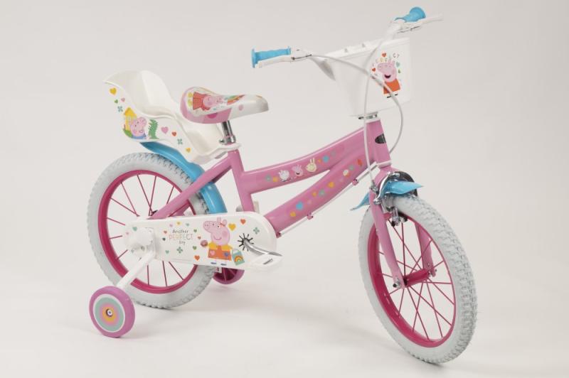 Detské kolo Toimsa T1695 Prasiatko Peppa 16 je odporúčané pre deti vo veku od 5 do 7 rokov a výšku postavy 105-125 cm. Odporúčaná výška rozkroku dieťaťa od zeme je 47-64 cm.Kolo má 16 palcové nafukovacie kolesá, lakované kovové ráfiky a dve brzdy, ktoré sa ovládajú páčkami na riadidlách. Zadné koleso má cvrčka (voľne sa otáča), takže dieťa nemusí šliapať počas celej jazdy. Základom kol značky Toimsa je kvalitný rám z Hi-Ten ocele.