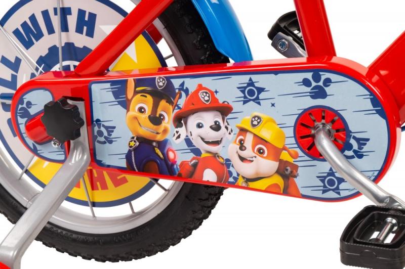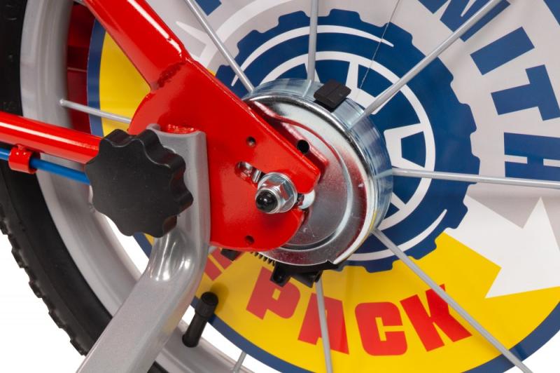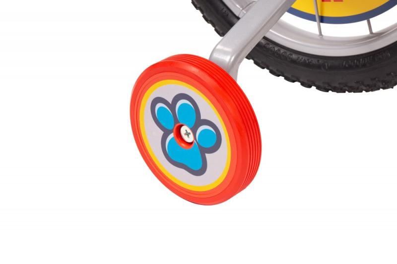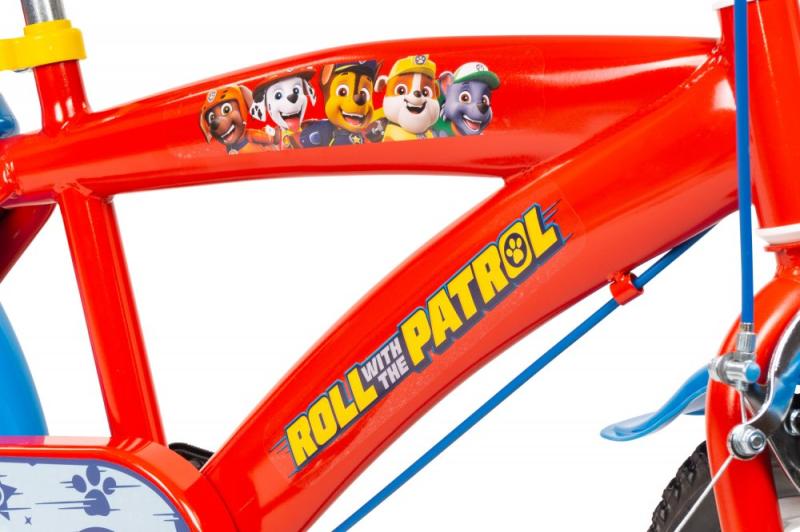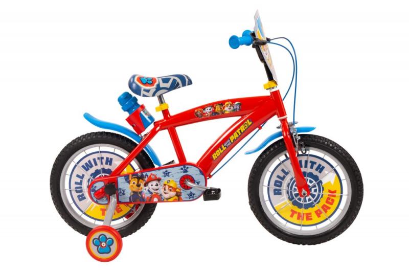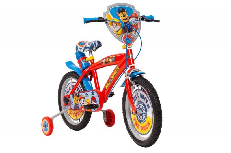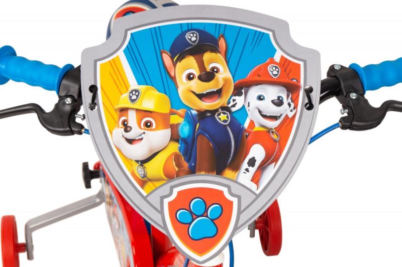 Detské kolo Toimsa T1678 Tlapková Patrola chlapčenské 16 (Paw Patrol boy) je odporúčané pre deti vo veku od 5 do 7 rokov a výšku postavy 105-125 cm. Odporúčaná výška rozkroku dieťaťa od zeme je 47-64 cm. Kolo má 16 palcové nafukovacie kolesá, lakované kovové ráfiky a dve brzdy, ktoré sa ovládajú páčkami na riadidlách.Zadné koleso má cvrčka (voľne sa otáča), takže dieťa nemusí šliapať počas celej jazdy. Základom kol značky Toimsa je kvalitný rám z Hi-Ten ocele. Hmotnosť kola so všetkými doplnkami je 10,5 kg. Maximálna hmotnosť jazdca je 37 kg. Súčasťou balenia je všetko príslušenstvo zobrazené na obrázku (blatníky, odrazky, kryt reťaze, nálepky, štít, fľaša na pitie). Kolo má komfortné polstrované sedlo a bezpečnostnú koncovku riadidiel. Výška riadidiel i sedla je nastaviteľná podľa výšky dieťaťa. Neoddeliteľnou súčasťou dodávky kola sú aj balančné kolieska, ktoré je možné veľmi jednoducho namontovať/odmontovať pomocou plastových matíc bez nutnosti použitia náradia či demontáže zadného kolesa.