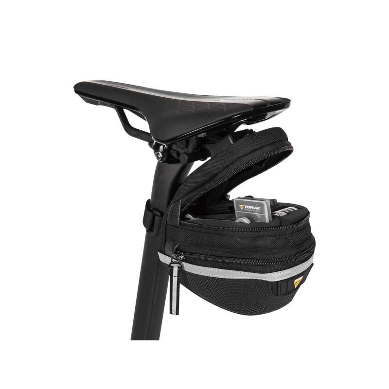 Táto podsedlová taška je aktualizovanou a vylepšenou verziou obľúbeného modelu Wedge Pack, vyrobená z mimoriadne odolného materiálu 1000 Denier Nylon, ktorý odolá bežnému opotrebovaniu pri jazde. Vďaka extra dlhému 3M reflexnému pásu zvyšuje bezpečnosť pri jazde za zníženej viditeľnosti alebo v noci. Súčasťou balenia je praktická pláštenka, ktorá ochráni obsah tašky pred dažďom.