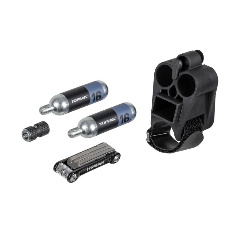 Kompaktní sada pro opravu pneumatik obsahuje hustilku CO2 Nano AirBooster, dvě 16g kartuše CO2 a skládací nářadí Mini 9 Pro pro silniční kola. Zobrazit celý popis