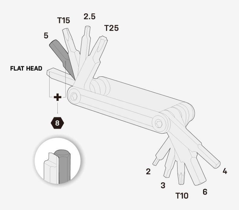Jeho jedinečná multifunkční konstrukce dokáže přeměnit plochý a 5mm imbusový klíč na 8mm imbusový klíč, čímž vás podrží na vašich cestách