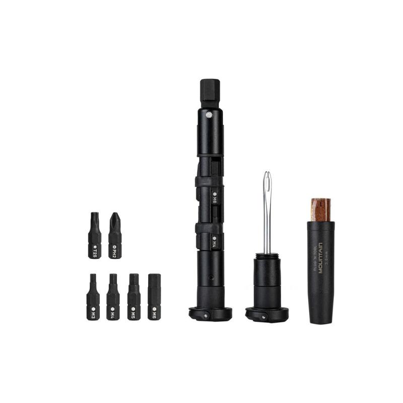 Dokonalý společník pro vaše horské kolo. Sady jsou dodávány s 3,5mm nástrojem pro zasunutí knotu na opravu bezdušových plášťů a kompletní sadou imbusových bitů 3/4/5/6/10 mm, bitů T25 Torx® a křížových bitů #2 pro údržbu kola