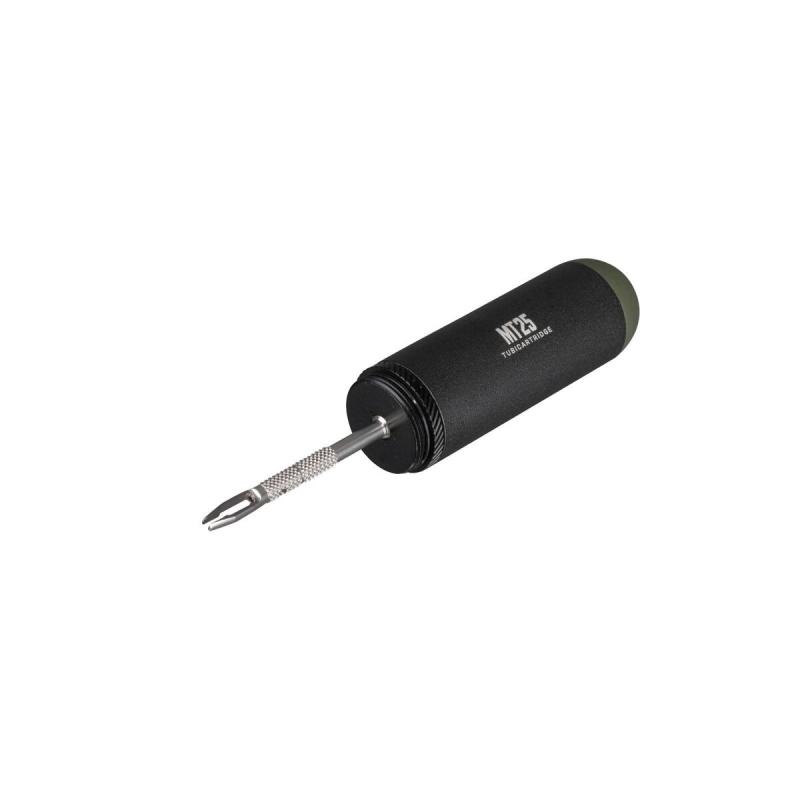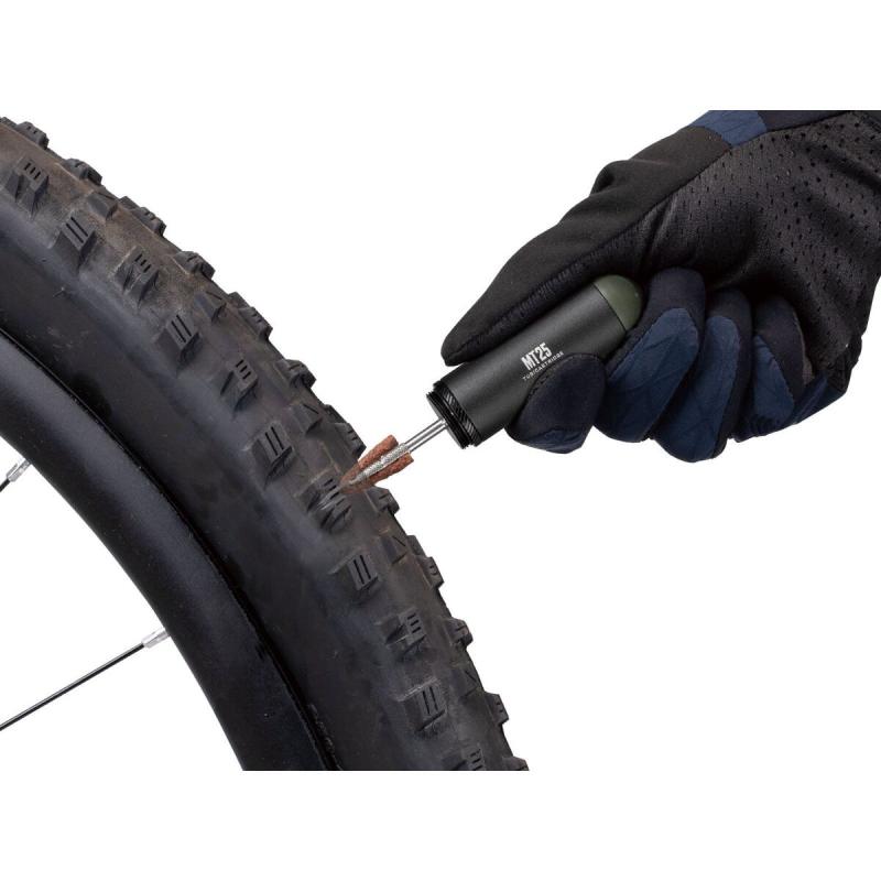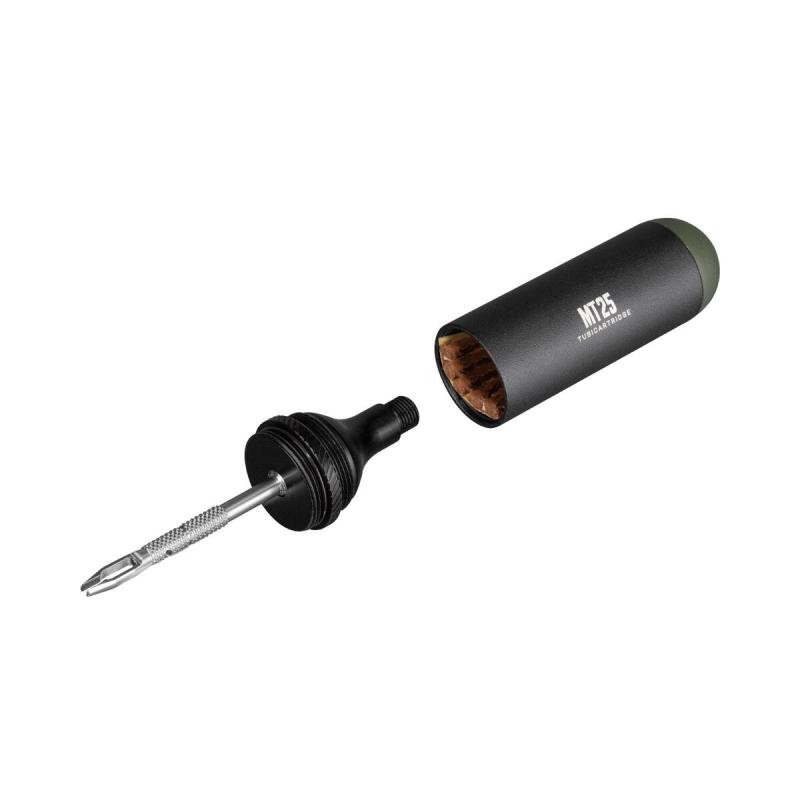 Sada pro opravu bezdušových MTB pneumatik kompaktně uložená v CO2 kartuši, která se používá samostatně pro opravu pneumatik nebo navíc s CO2 hustilkou pro přímé nahuštění pneumatik.Nástroje: