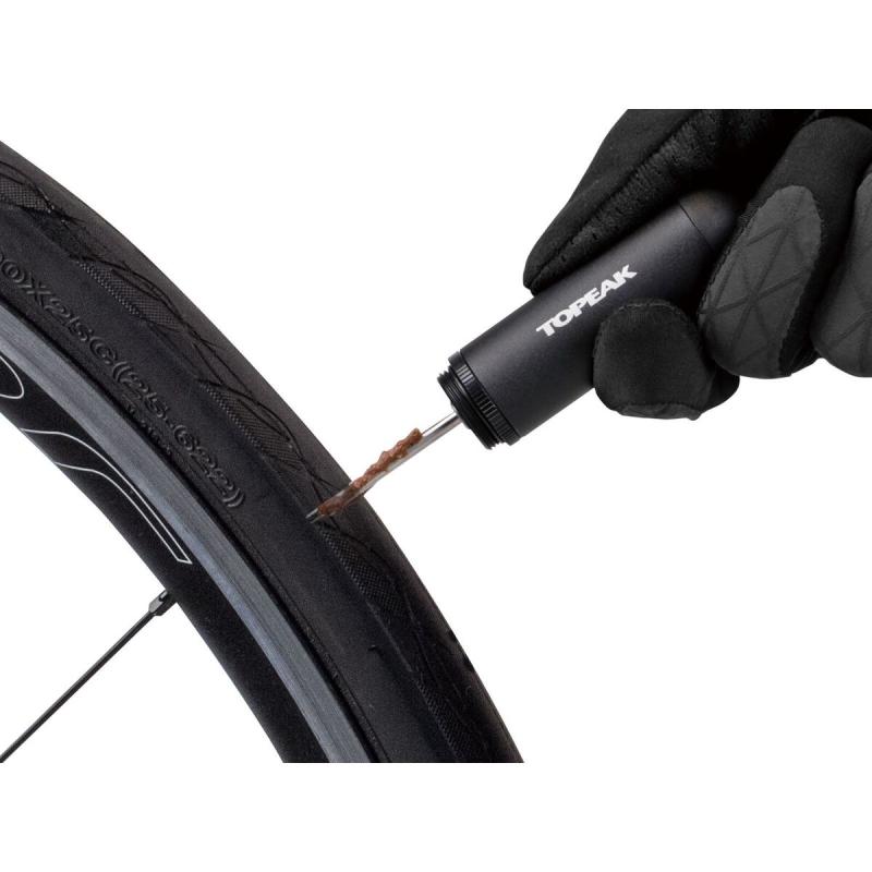 Sada na opravu bezdušových cestných pneumatík kompaktne uložená v CO2 kartuši, ktorá sa používa samostatne na opravu pneumatík alebo navyše s CO2 hustilkou na priame nahustenie pneumatík.Nástroje: