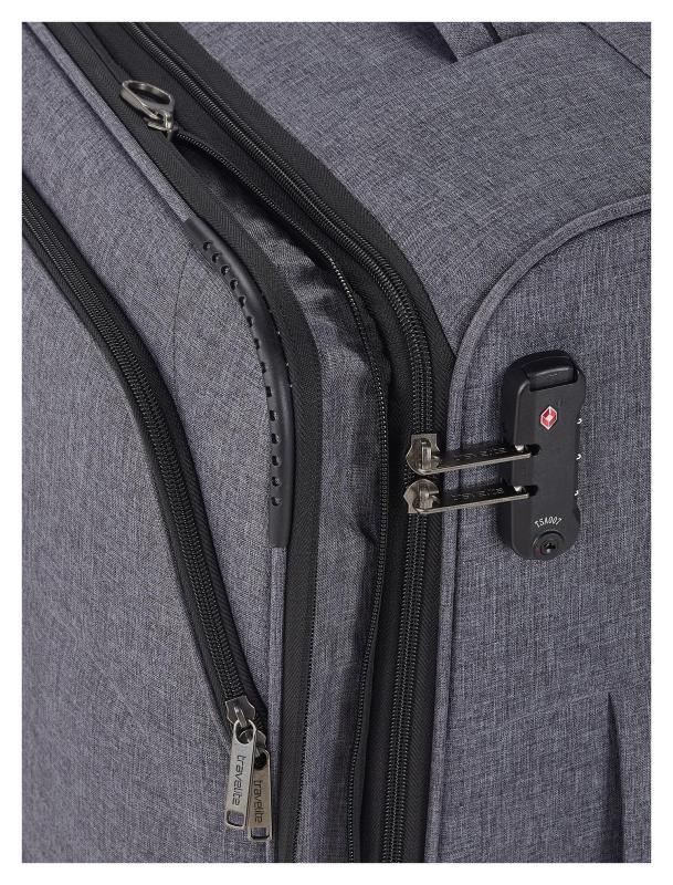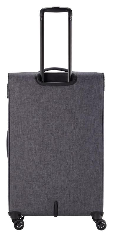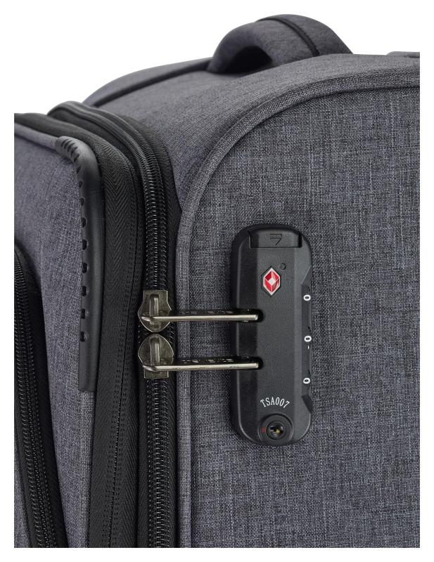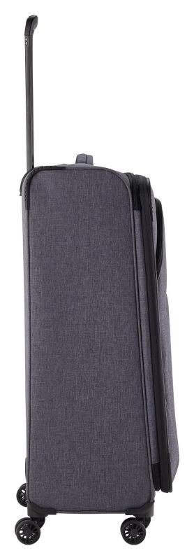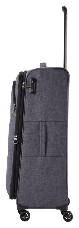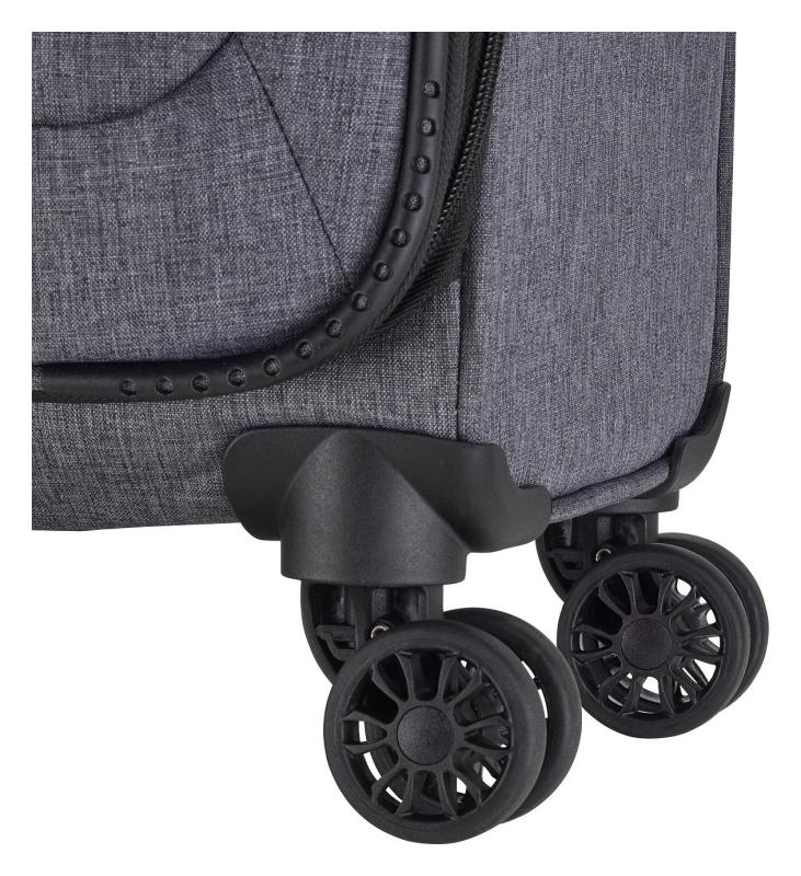 Textilní kufr na čtyřech kolečkách s praktickou přední kapsou na zip, integrovaným TSA zámkem a expandérem.4 dvoukolečka otočná o 360°