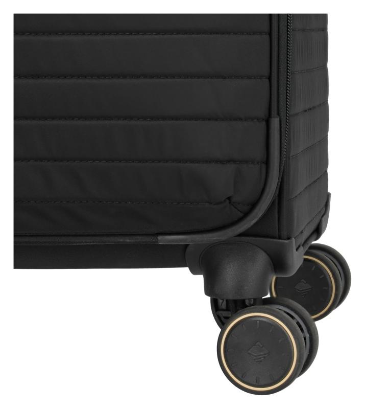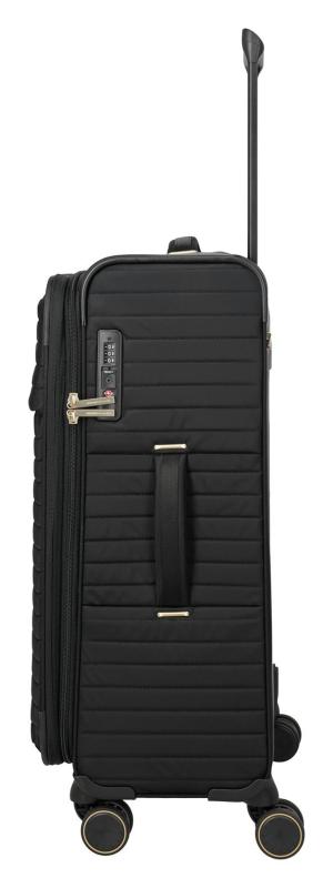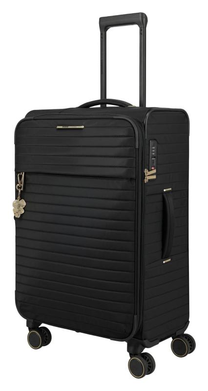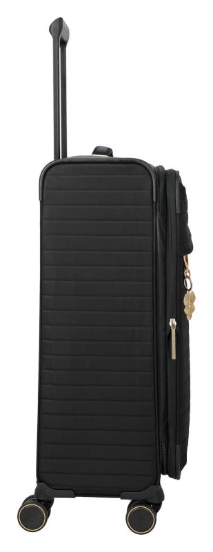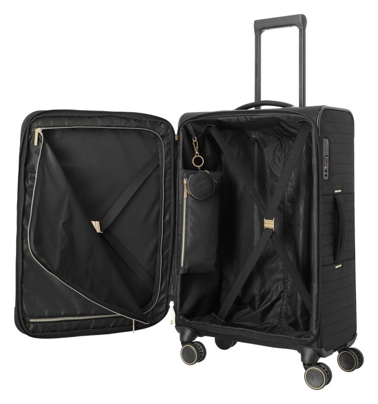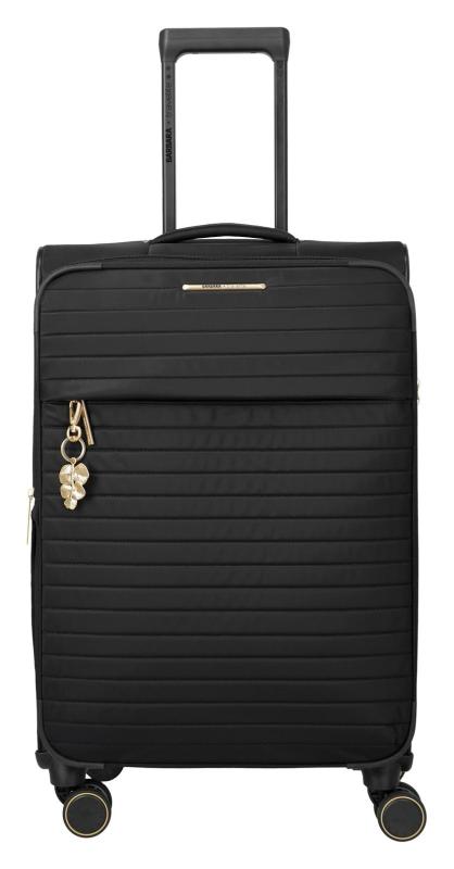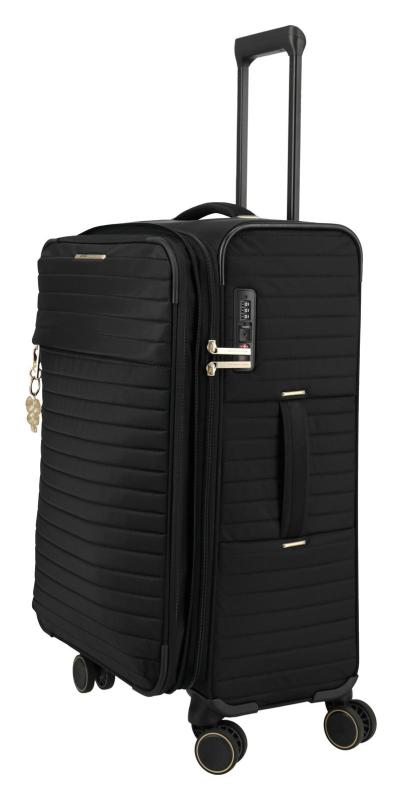 Luxusný štvorkolesový textilný dámsky stredne veľký kufor s integrovaným TSA zámkom, expandérom, menovkou, vyberateľným obalom na topánky, puzdrom na šperky a štýlovou kľúčenkou vyrobený z recyklovaného nylonu a polyesteru.