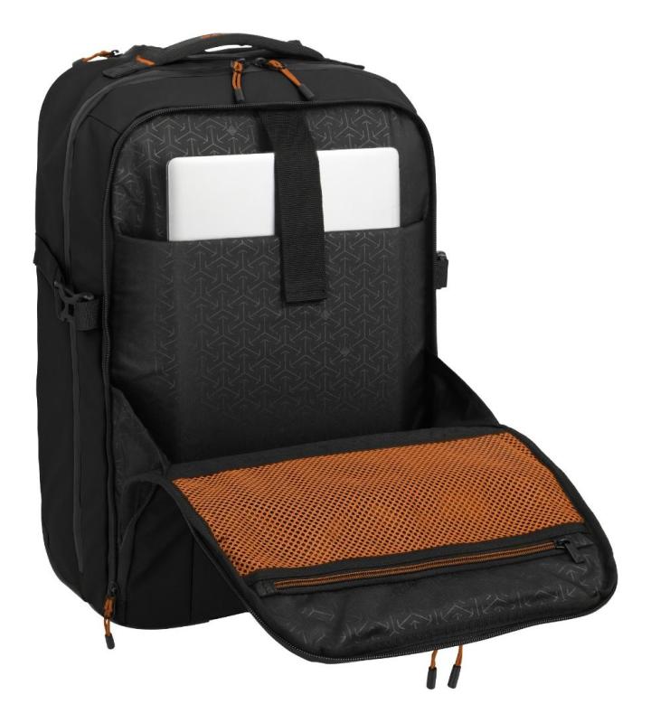 Ramenní popruhy jsou pohodlné, nastavitelné a lze je zasunout do speciální kapsy, což umožňuje snadné přepnutí mezi nošením na zádech a tažením. Průvlek na zádovém panelu umožňuje batoh nasadit na rukojeť kufru, čímž se usnadní manipulace s více zavazadly.