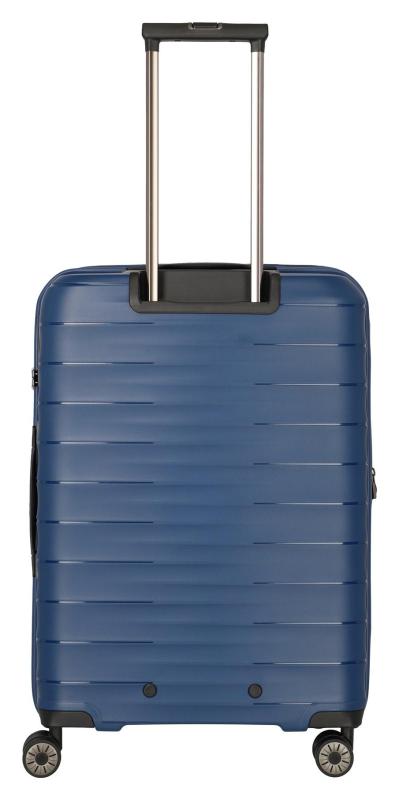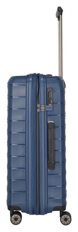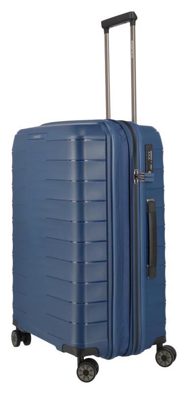 Stredný skořepinový cestovný kufor na štyroch kolieskach z recyklovaného polypropylénu s integrovaným TSA zámkom, expandérom a zipsom odolným voči dažďu.