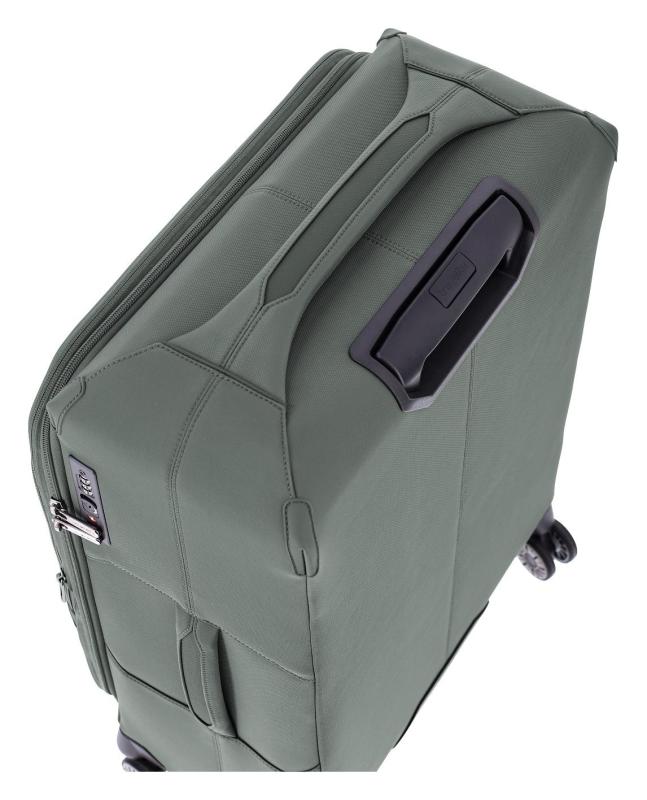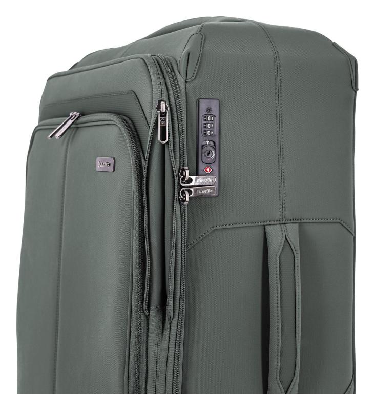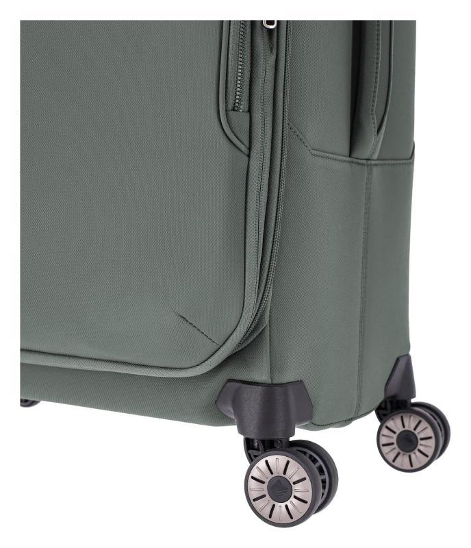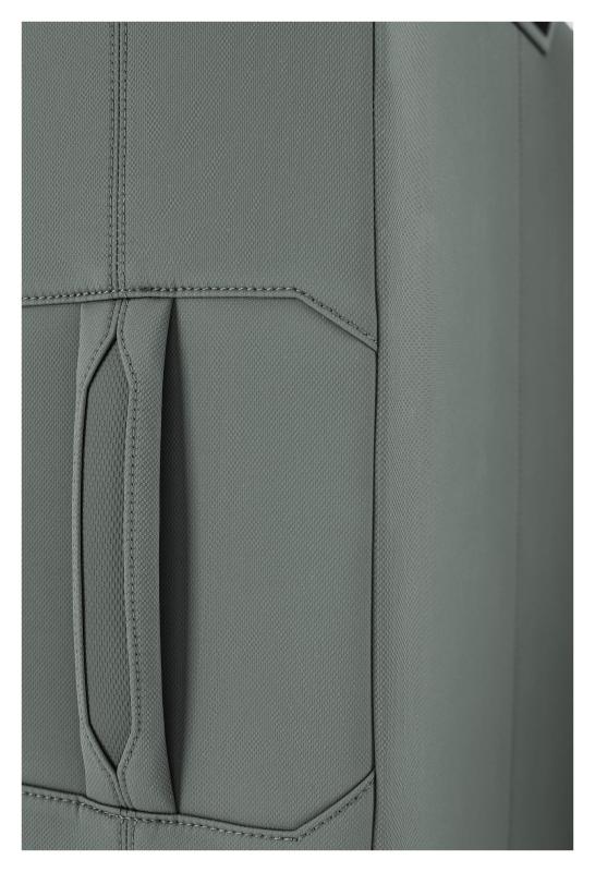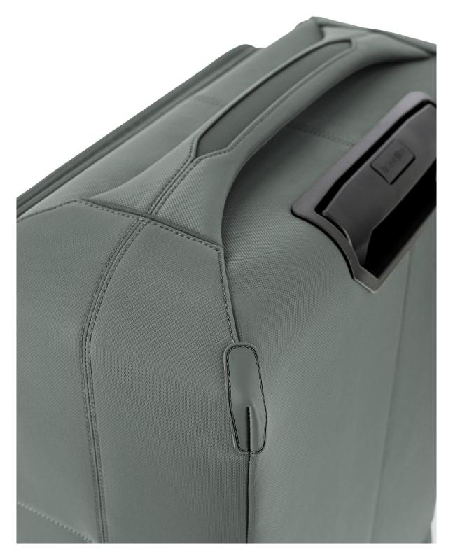 Lehký textilní kufr na čtyřech kolečkách z recyklovaného nylonu s vnitřní konstrukcí ze sklolaminátu vybavený vyjímatelným balicím panelem, TSA zámkem a expandérem.