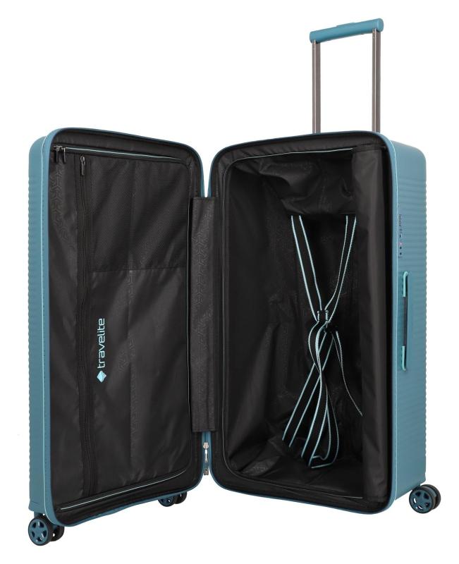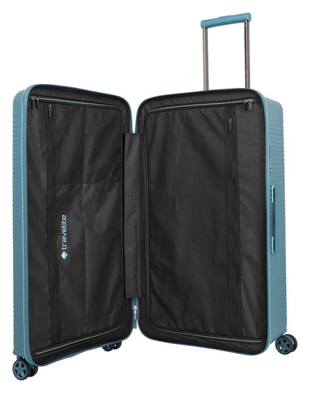 Uvnitř kufru najdete oboustranný systém balení s dvěma textilními dělicími příčkami na zip, které pomáhají udržet věci přehledně uspořádané. Kompresní popruhy zajistí, že obsah zůstane pevně na svém místě. Dále jsou k dispozici dvě vnitřní kapsy na zip pro drobnosti, které chcete mít snadno po ruce.