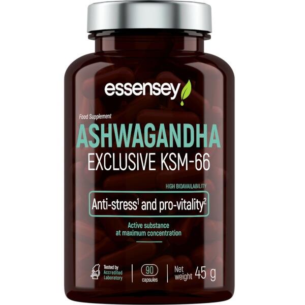 ESSENSEY ASHWAGANDHA EXCLUSIVE KSM-66. Doplnok stravy. Prípravok v kapsuliach s obsahom extraktu z koreňa ashwagandhy (Withania somnifera) KSM-66. KSM-66 Ashwagandha je registrovaná ochranná známka spoločnosti Ixor. Ashwagandha zvyšuje odolnosť organizmu voči stresu. Ashwagandha navyše pomáha udržiavať optimálny pomer energie a vitality.