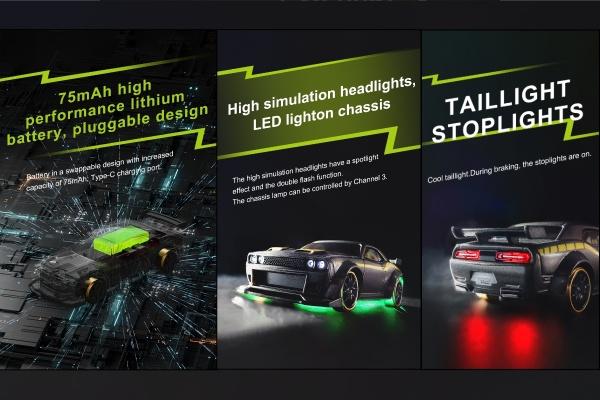 - prepínateľnými prednými a zadnými svetlami a neónovými efektmi ovládanými z vysielača