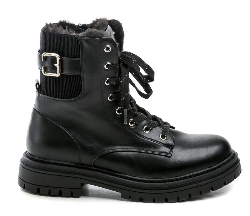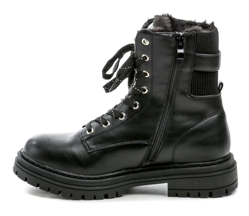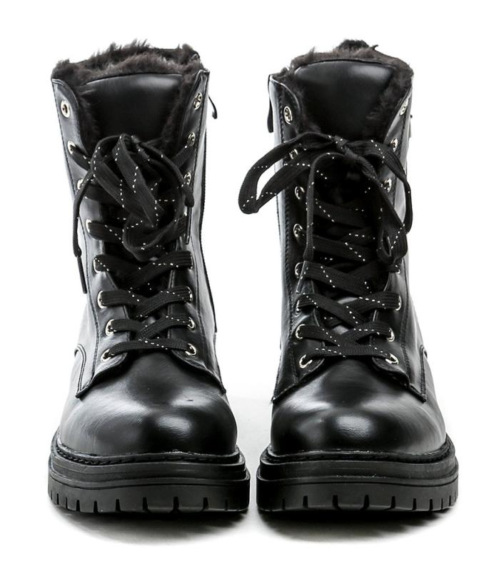 Dámská zimní obuv na šněrování i zip s chlupatým textilním kožíškem uvnitř, z kombinace syntetického a textilního materiálu, výška 20 cm, podpatek 4 cm. Zobrazit celý popis