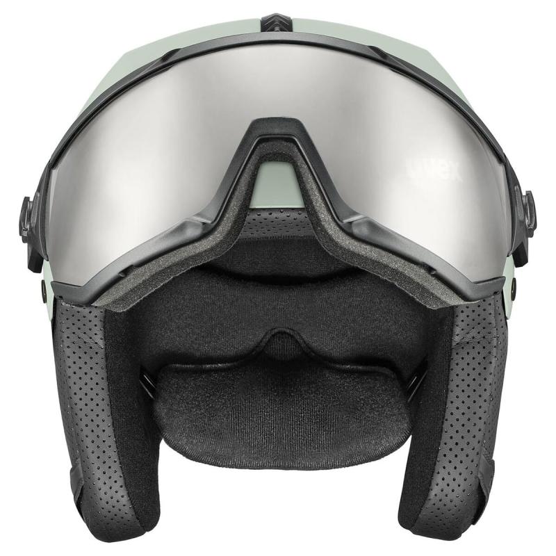 Součástí je stříbrný zrcadlový štít s technologií uvex supravision®, která zabraňuje zamlžení a zajišťuje jasný výhled i při rychlé jízdě. Štít je anatomicky tvarovaný, těsně přiléhá k obličeji a nabízí tři polohy zastavení, čímž umožňuje snadné přizpůsobení aktuálním podmínkám.