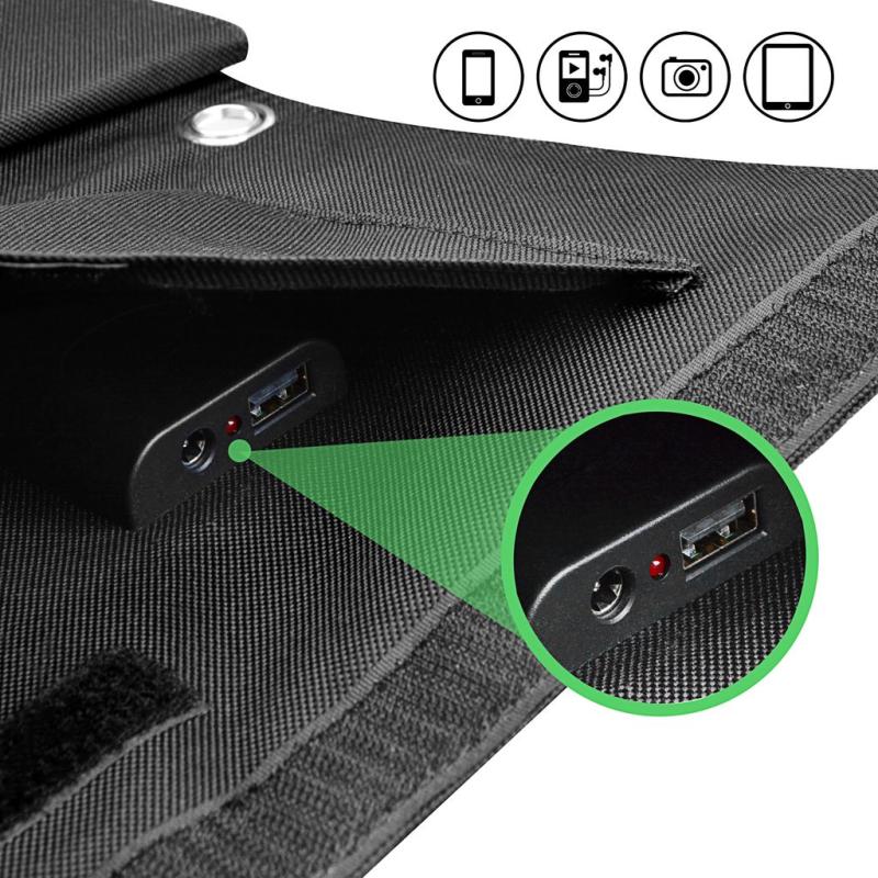 Panel je navržen jako kompaktní a lehký pomocník, který snadno připevníte pomocí hliníkových karabin k batohu, kolu, stanu nebo jiné výbavě. Voděodolné polyesterové pouzdro chrání solární články před nepříznivými povětrnostními vlivy a mechanickým poškozením, takže můžete zařízení používat i za méně příznivých podmínek.
