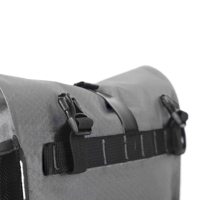Xtouring Accessory Bag DRY lze nainstalovat spolu s Xtouring Handlebar Harness brašnou. Rolovací uzávěr upravuje kapacitu podle převáženého množství a dvojité boční síťované kapsy nabízejí další rychlý přístup k úložnému prostoru.