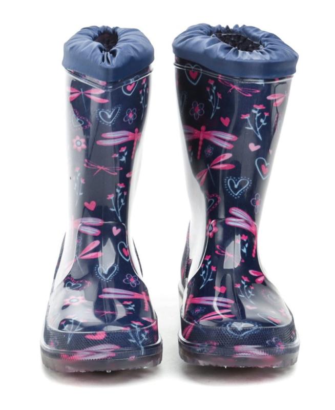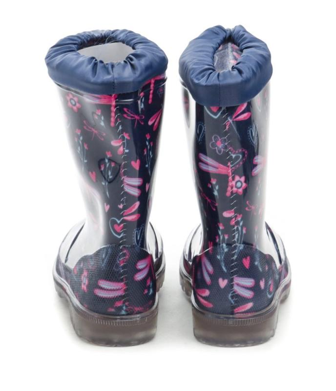 Obuv je vyrobena z průhledného gumového materiálu. Vnitřní část obuvi je vybavena textilní podšívkou, která tvoří barvu a motiv holínky.