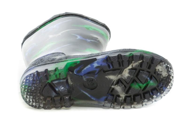 Obuv je vyrobená z priehľadného gumového materiálu. Vnútorná časť obuvi je vybavená textilnou podšívkou, ktorá tvorí farbu a motív čižmy.
