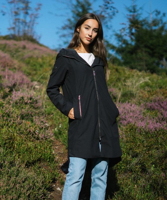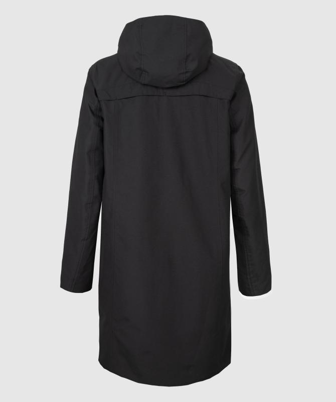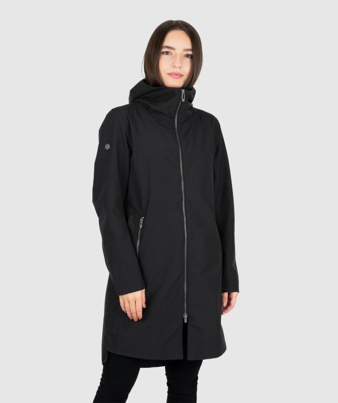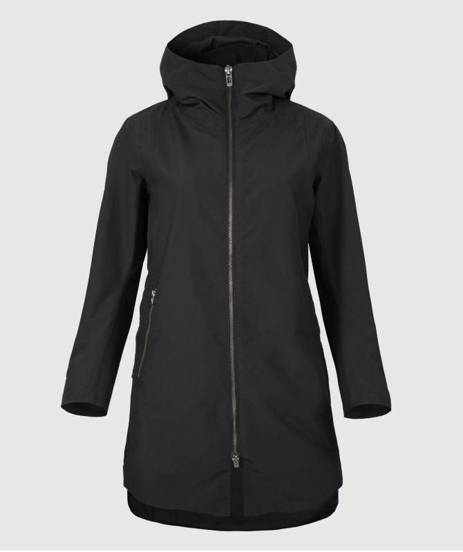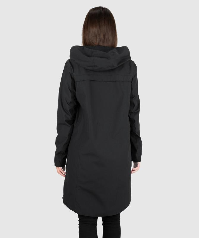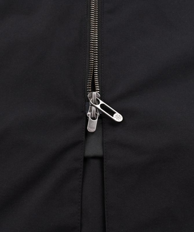 Bunda voľnejšieho strihu, 100% recyklovaný polyester, vodeodolnosť 8000mm, paropriepustnosť 3000g/m2/24h, hlavný dvojcestný kovový zips, dve hlavné lištové vrecká, vonkajšie uzatvárateľné vrecko na zips, vnútorné priestranné vrecko na zips, funkčná ventilácia na zadnom diele, bočné rozparky a predĺžený zadný diel, podlepené švy, pružná wooxusná podšívka.