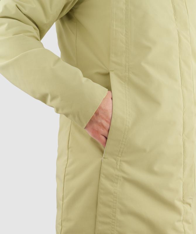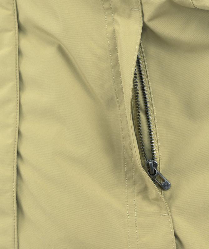 Kabát je vyrobený z odolného materiálu zloženého zo 100 % recyklovaného polyesteru, čo ocenia tí, ktorí preferujú udržateľnú módu. Vďaka funkčnej membráne s vodným stĺpcom 10 000 mm a paropriepustnosťou 10 000 g/m2/24h zostane vaše telo suché aj pri daždi alebo snežení, zatiaľ čo pot môže voľne unikať von. Povrchová úprava DWR PFC Free je ekologická a odpudzuje vodu bez použitia škodlivých fluórovaných látok.