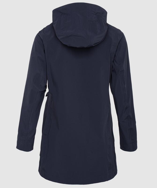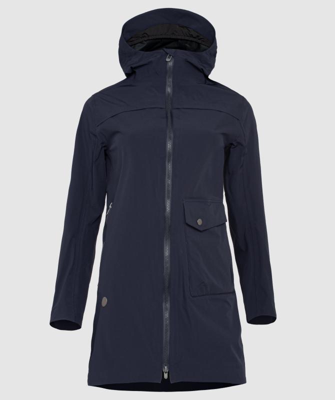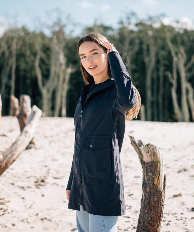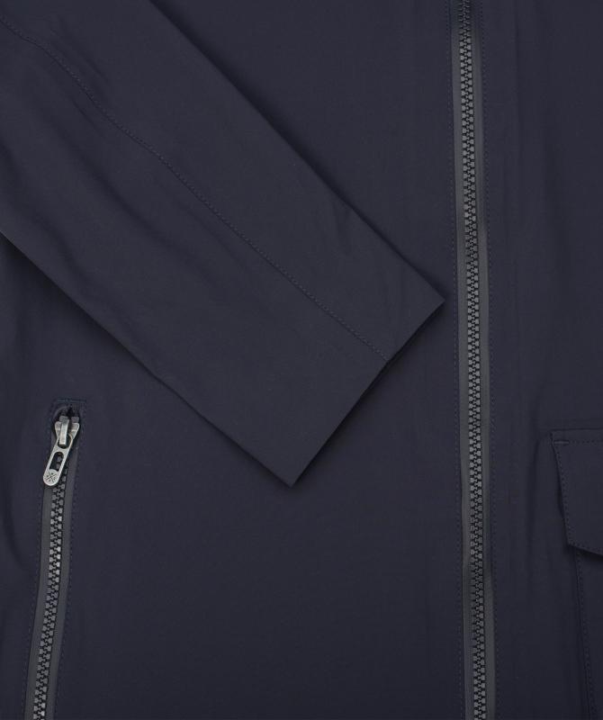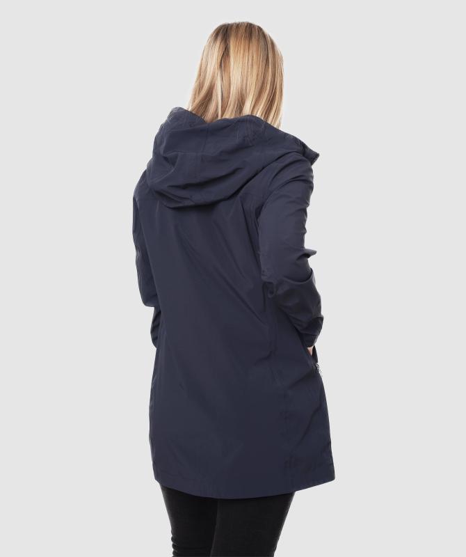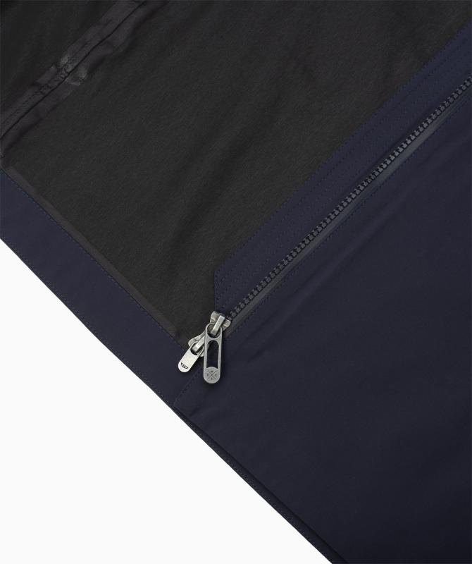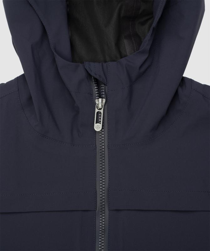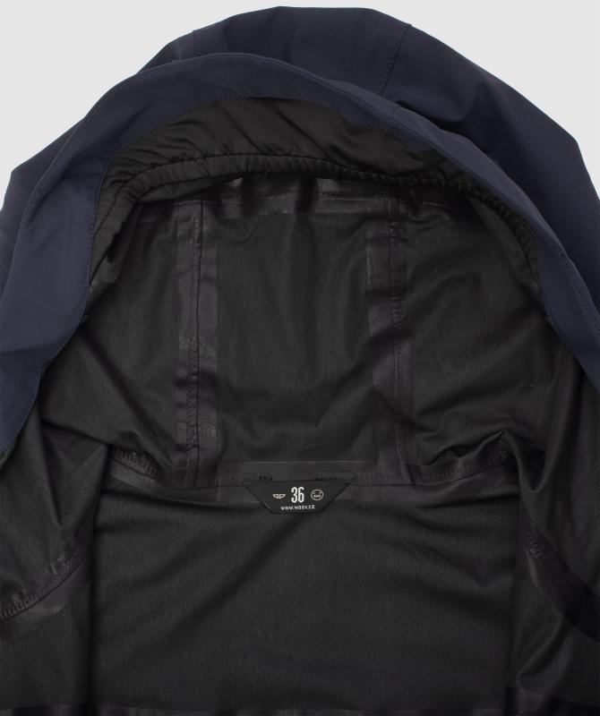 87% nylon, 13% elastan, lehounký třívrstvý stretchový materiál s membránou, vodní sloupec 10 000mm, paropropustnost 10 000g/m2/24h, podlepené švy, voděodolné zipy, hlavní zip dvoucestný, horizontální stahování kapuce s vnitřním lemem proti sklouznutí, prostorné kapsy, skvěle padnoucí wooxusní střih.