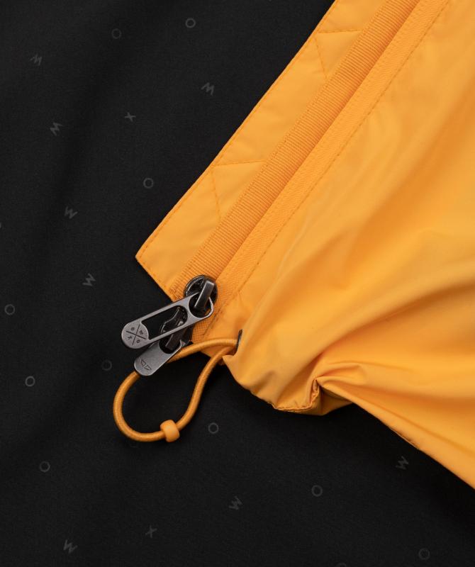 100% recyklovaný polyester,voděodolnost 8000 mm, paropropustnost 5000 g/m2/24h, povrchová voděodpudivá úprava materiálu DWR PFC free, voděodolné zipy, podlepené švy, pružné ukončení rukávů, stahování spodního okraje