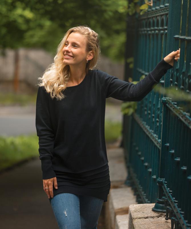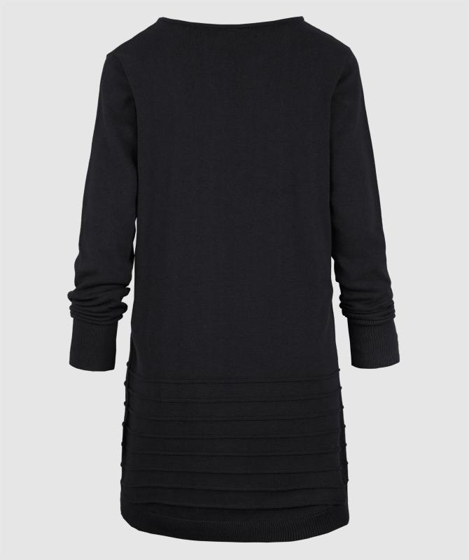 Svetr speciálně na klouzačku. Střih pod zadek, zrychlovací pruhy. Pokud v něm ale vyrazíte mezi dospělé, pochválí vám úplně jiné přednosti, než profesionální skluz.Pantone: Black Beauty