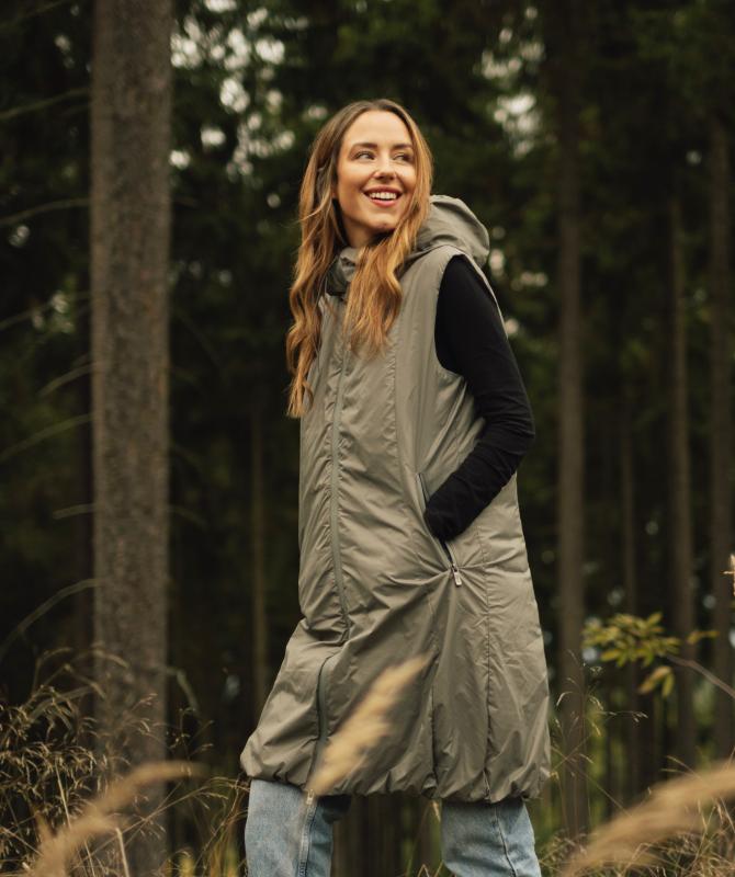 Či už idete von s košíkom, psom alebo s akýmkoľvek skvelým zámerom, často sa vám nechce natlačiť do bundy či kabátu. Voľne strihaná vesta po kolená z recyklovaných materiálov s vodeodolnou úpravou šetrnou k prírode je presne to, na čo svet čakal. Teda vy.- štýlová vesta, ktorá vás zahreje a rozžiari v každej situácii