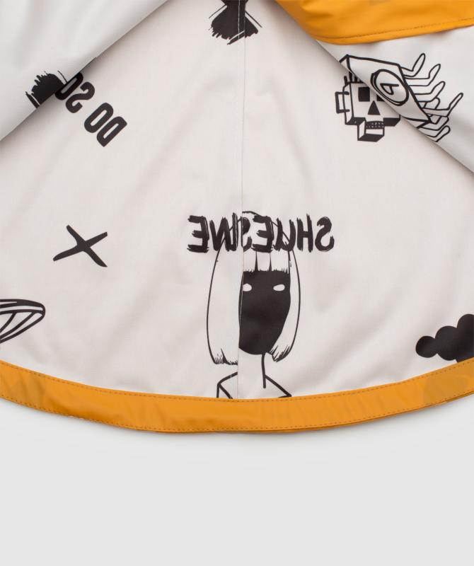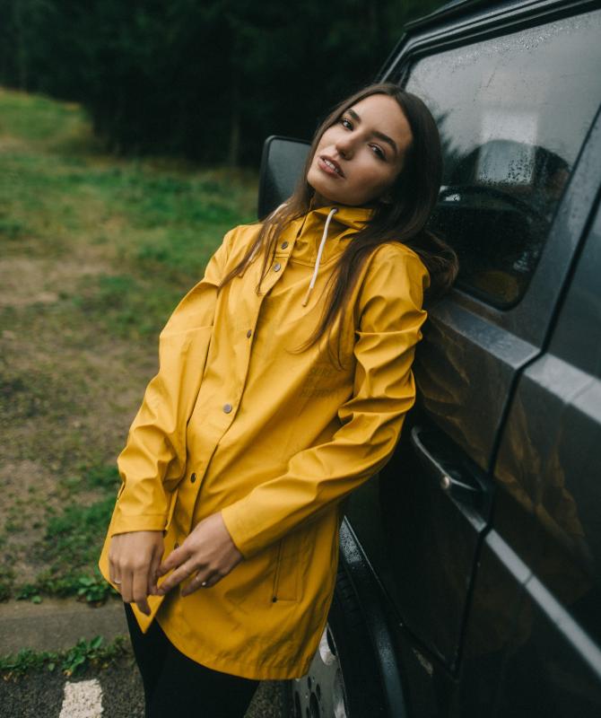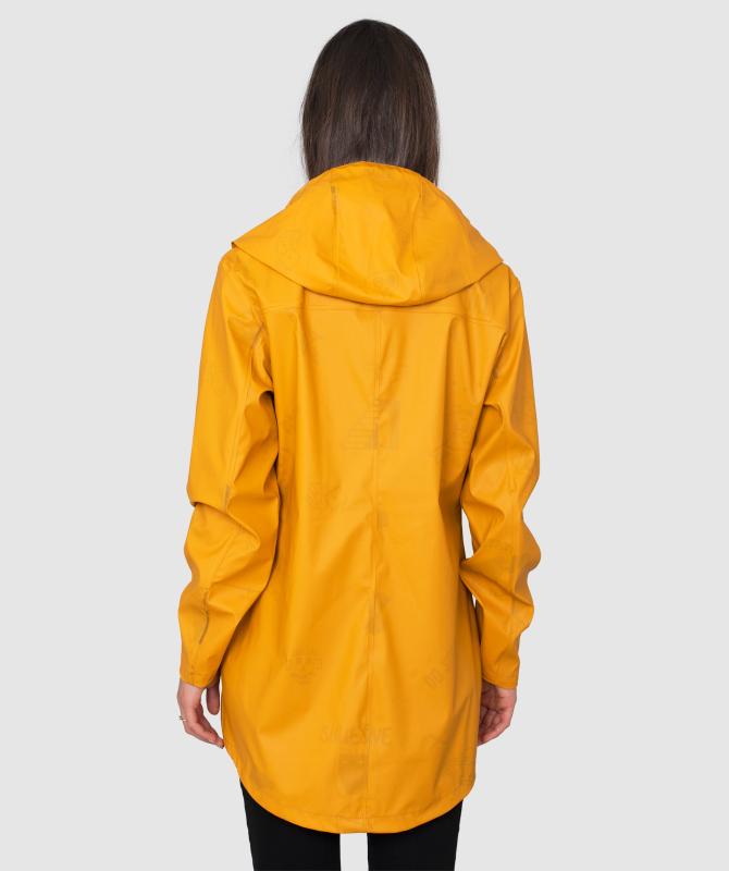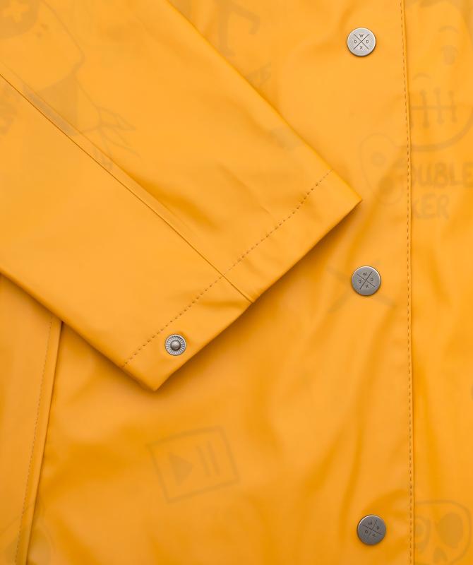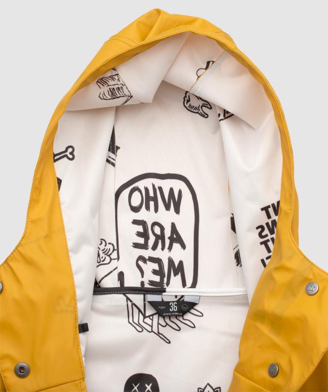 Pohodlná nepromokavá pláštěnka s podtištěnou podšívkou, která prostupuje a je viditelná, 55% polyuretan a 45% polyester, zapínání na druky, boční kapsy překryté lištou, lepené švy, stahovatelná kapuce, nastavitelné rukávy se zapínám na druk.