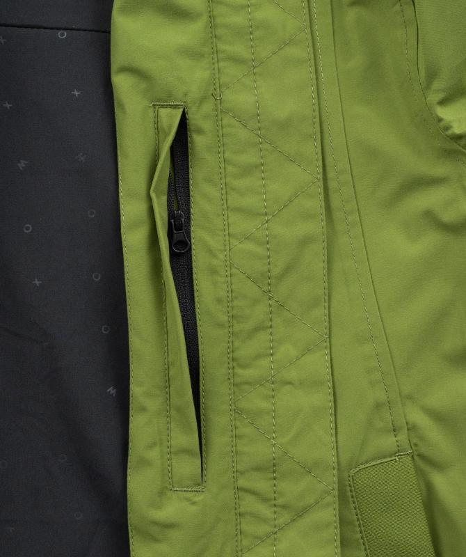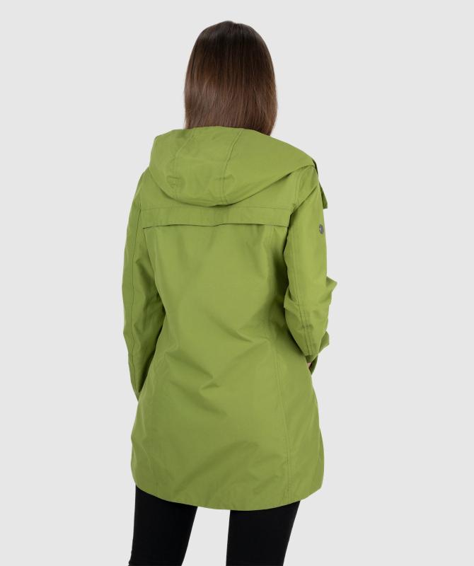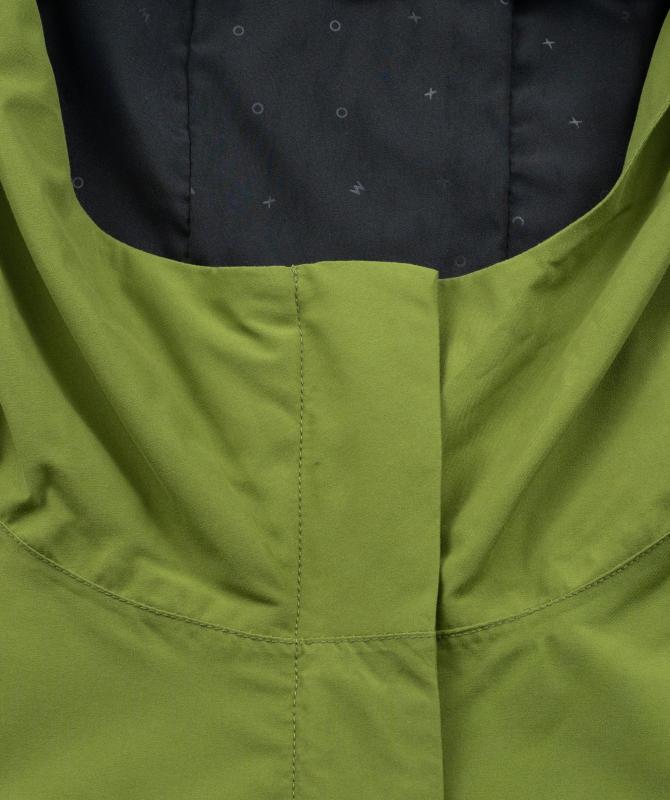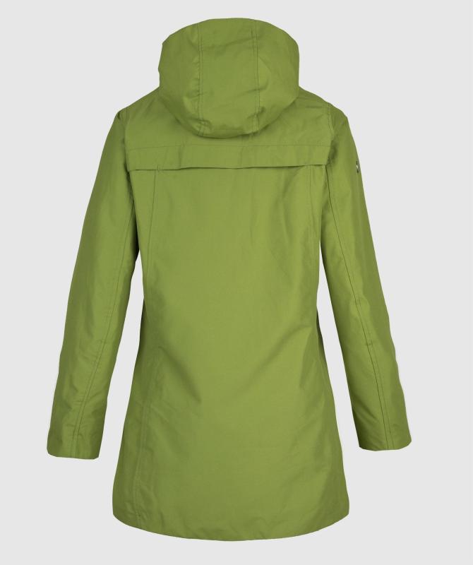100% recyklovaný polyester, voděodolnost 8000mm, paropropustnost 3000g/m2/24h, povrchová úprava - DWR PFC free, wooxusní pružná podšívka, hlavní dvoucestný kovový zip překrytý klopou, hlavní lištové kapsy ukončené ozdobným lemem, odvětrávání zádech, vnitřní kapsa uzaviratelná na zip, tvarovaná spodní délka.