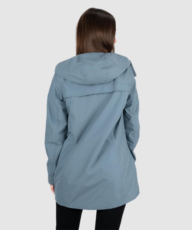 100% recyklovaný polyester, vodeodolnosť 8000mm, paropriepustnosť 3000g/m2/24h, povrchová úprava - DWR PFC free, wooxusná pružná podšívka, hlavný dvojcestný kovový zips prekrytý klopou, hlavné lištové vrecká ukončené ozdobným lemom, odvetrávanie na chrbte, vnútorné vrecko uzatvárateľné na zips, tvarovaná spodná dĺžka.