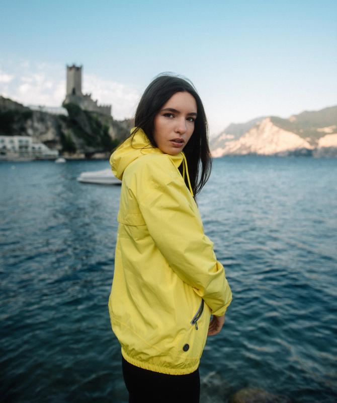 Bunda sportovního střihu se spadeným rukávem, 100% recyklovaný polyester, voděodolnost 8000mm, paropropustnost 3000g/m2/24h, voděodpudivá povrchová úprava - DWR PFCfree, hlavní kovový zip, dvě hlavní kapsy uzaviratelné na kovové zipy, rukávy jsou ukončeny pružnou manžetou, vnitřní prostorná kapsa na zip, podlepené švy, pružná wooxusní podšívka, pružný spodní lem s vnitřním silikonovým proužkem, stahovatelná kapuce, funkční ventilace na zadním dílu.