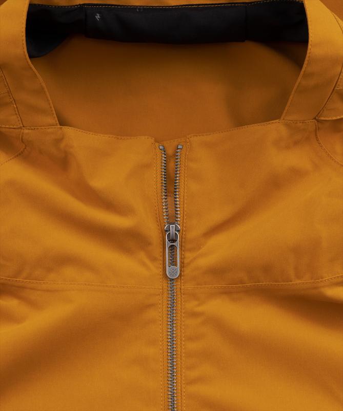 Svrchní materiál 100% polyester pružné konstrukce, podšívka 100% recyklovaný polyester, voděodolnost 8000 mm, paropropustnost 5000 g/m2/24h, povrchová voděodpudivá úprava materiálu DWR PFC free, podlepené švy, dvoucestný ocelový hlavní zip, stahování v pase, horizontální stahování kapuce, ventilace na zádech