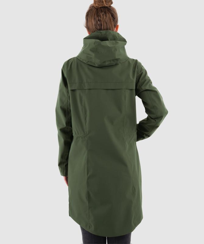 Jdete lesem, mrholí a pofukuje. Před vámi kopec, za ním už začnete sestupovat do města. Nevadí vám déšť – membrána ho zadrží. Je příjemné stoupat, pružný a prodyšný materiál vás neomezuje v pohybu. Cítíte se fajn, je skvělé být v přírodě. Ale těšíte se mezi lidi, protože vám to dneska děsně sekne. Upravíte stahování v pase a vyrazíte do ulic. Umí tohle váš kabát?- pružný materiál bez příměsi elastanu, tedy recyklovatelný