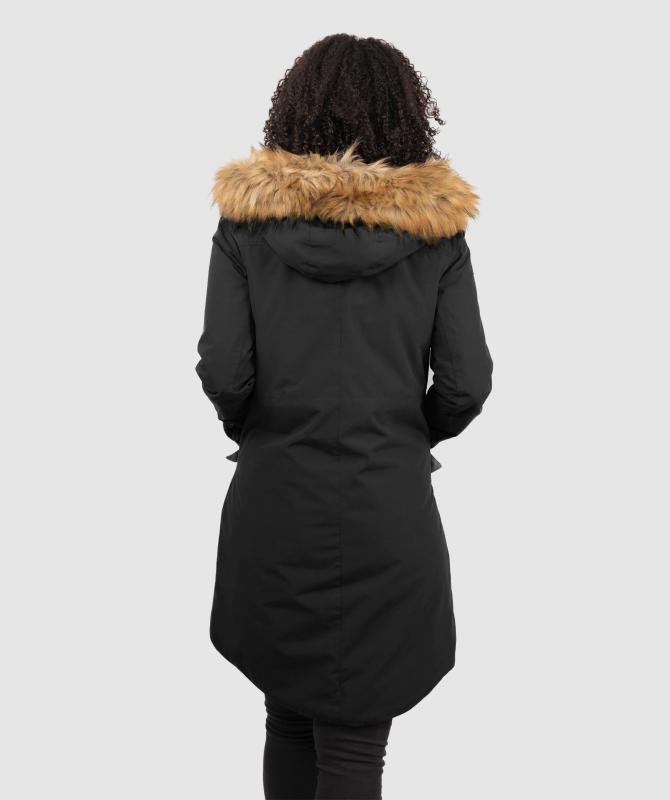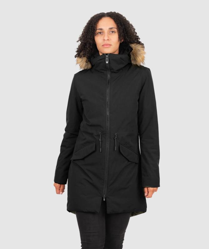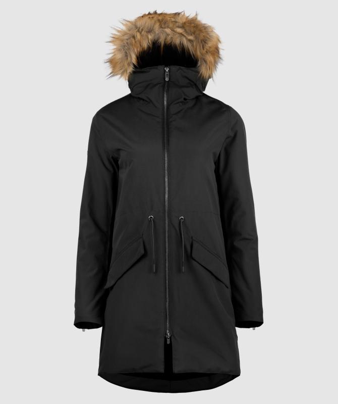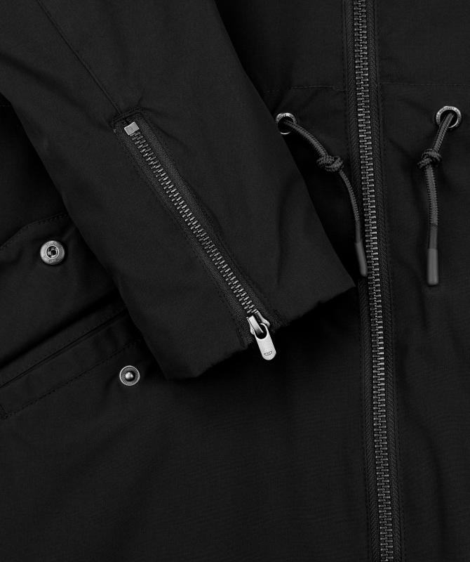 100% recyklovaný polyester, zateplení Sorona DuPont, tělo 120g, rukáv/kapuce 80g, voděodolnost 8000mm, paropropustnost 3000/m2/24, prošívaná pružná podšívka z recyklovaného materiálu, podlepené švy, vnitřní kapsa uzavíratelná na zip, boční kapsy s patkou uzavíratelné na druk, stahování v pase, nastavitelné rukávy se zapínám na zip, odnímatelný kožicholem na kapuci.
