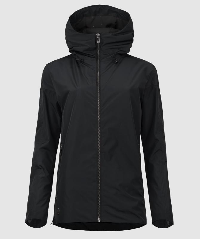 100% recyklovaný polyester, vodeodolnosť 8000 mm, paropriepustnosť 5000 g/m2/24h, povrchová vodeodpudivá úprava materiálu DWR PFC free, podlepené švy, oceľové zipsy - hlavné i kapsové, vertikálne sťahovanie rukávov pre nastavenie dĺžky, ventilácia na bokoch na zips