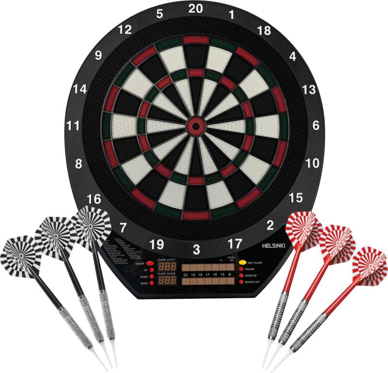Elektronické šipky s terčem o průměru 34 cm pro 1–8 hráčů, 43 her a 320 variant, automatickým počítáním skóre a úsporným napájením na baterie.Elektronické šipky nabízejí kvalitní a odolné provedení s tenkou spider konstrukcí, která snižuje riziko odrazů šipek. Segmenty terče jsou vybaveny pěti otvory na každém double a triple, což zvyšuje šanci na vyšší skóre a zpříjemňuje hru. Terč je určen výhradně pro softtip šipky a má průměr 34 cm, což odpovídá standardním rozměrům pro pohodlnou hru.