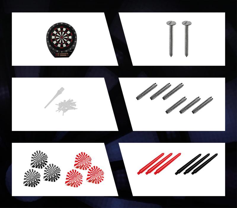 Součástí balení jsou dvě kompletní sady softtip šipek (6 kusů) včetně hrotů, barrelu, shaftů a letů, doplněné o 24 náhradních softtip hrotů. Terč je vybaven červeně podsvíceným LCD displejem s automatickým počítáním skóre a dvěma displeji pro hru XO Cricket, což usnadňuje sledování výsledků a zvyšuje komfort používání.