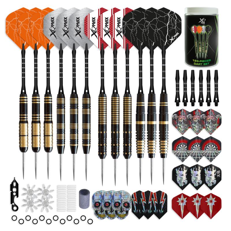 123-dílná sada XQMax šipky 12x Steel Brass + příslušenství – obsahuje 4 sady (po třech šipkách) steel - hlavní/barellů. Technický popis:
