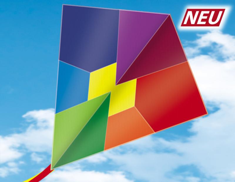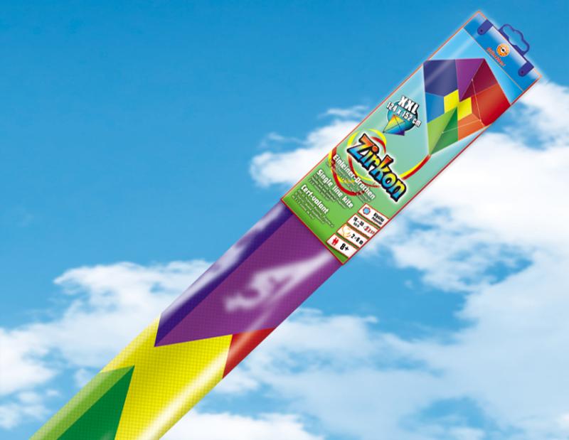 PESTROBAREVNÝ létající drak ZIRKON, vel. XXL jednošňůrový, lehký a pevný POLYESTER, ocas 6 m, vítr 12-30 km/h.